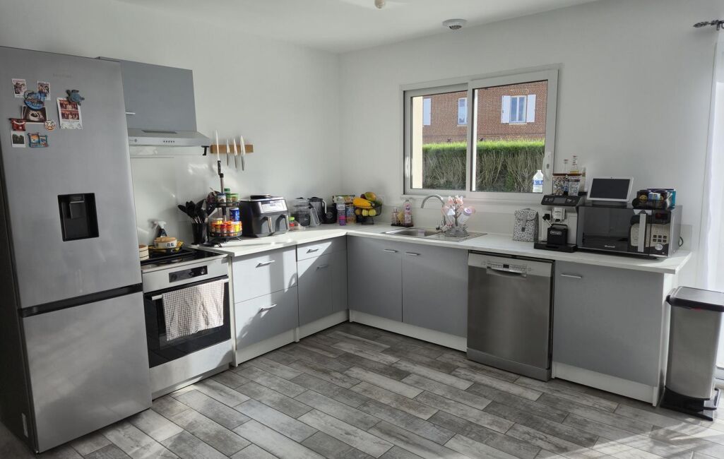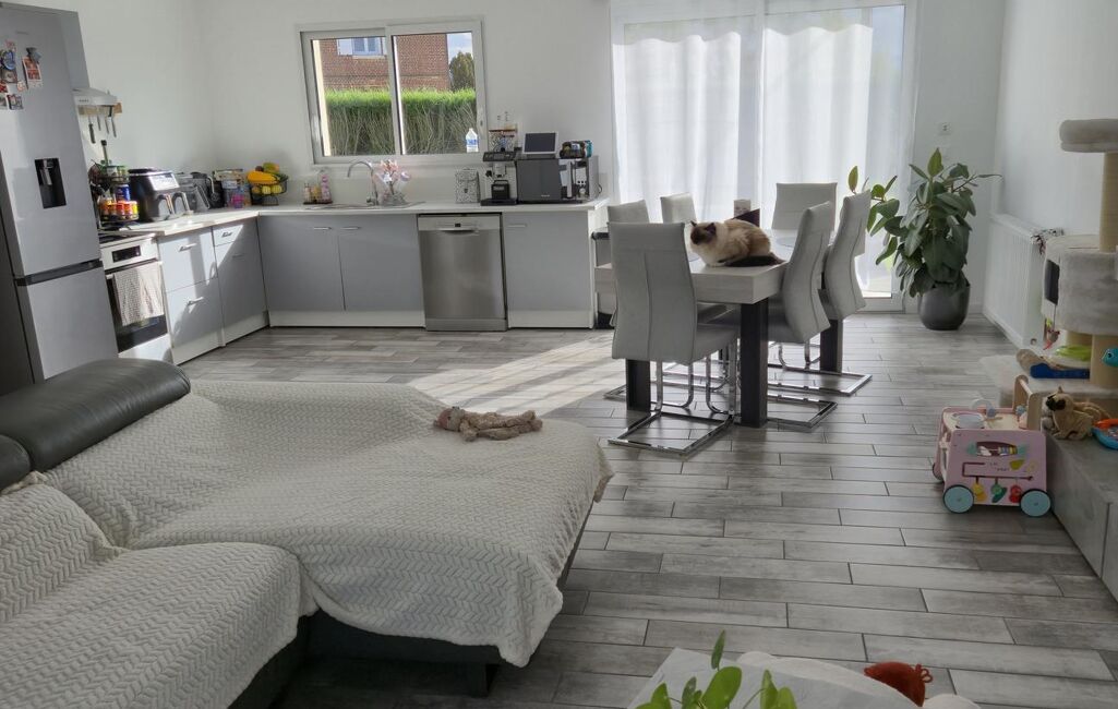 Maison de plain-pied sur un terrain d'environ 860m² comprenant: une entrée donnant sur la cuisine aménagée ouverte sur le séjour/salon, trois chambres, salle de bains/douche, cellier et wc.