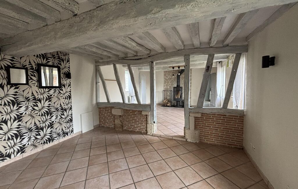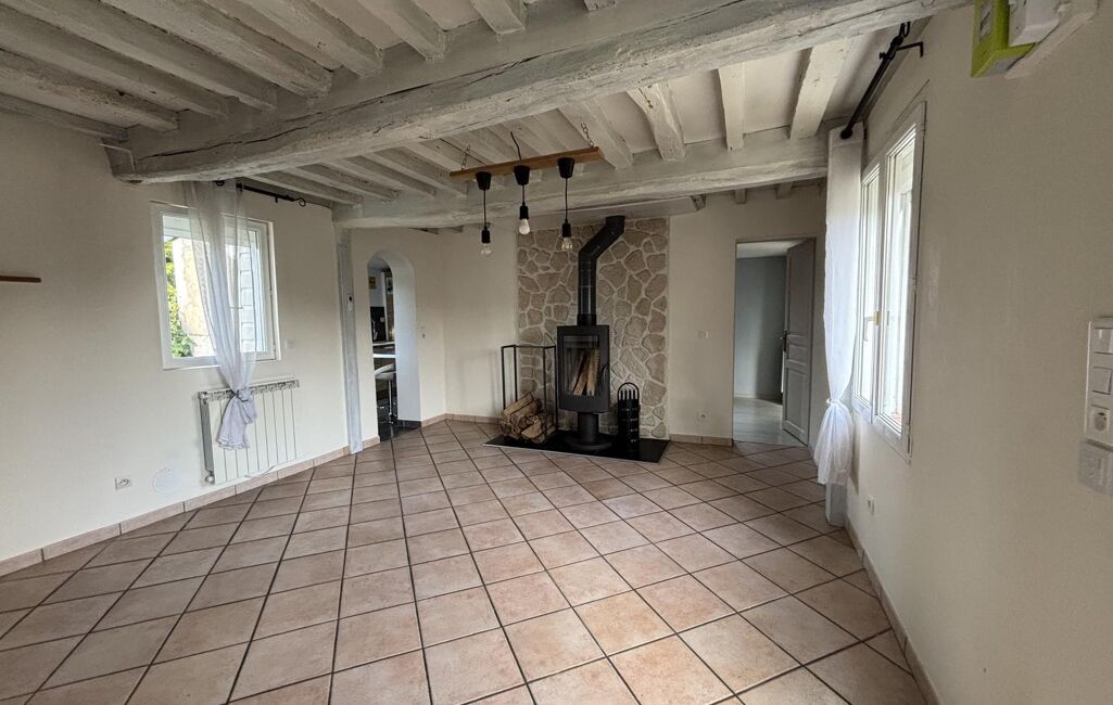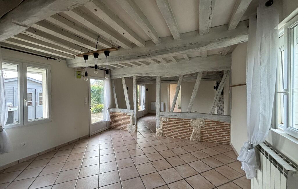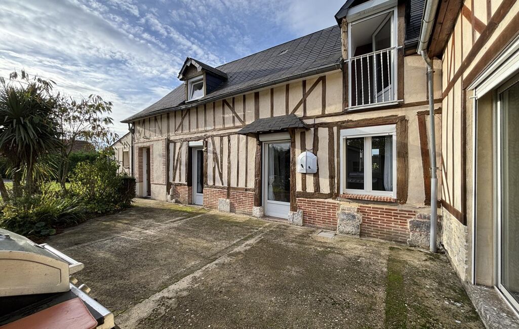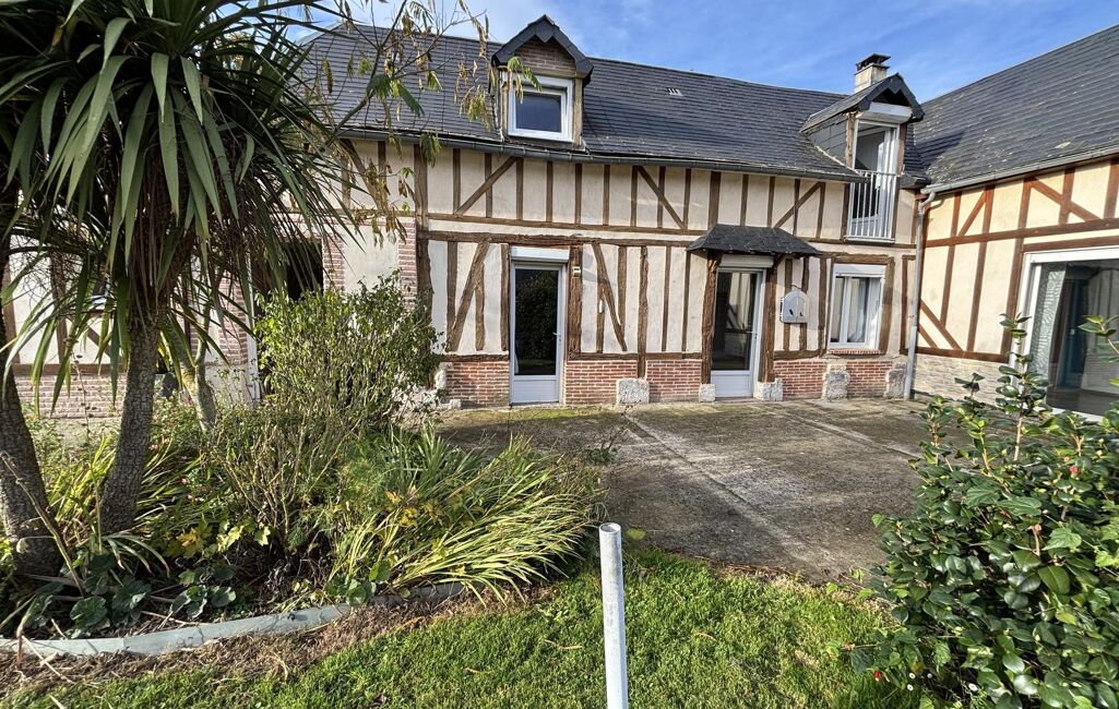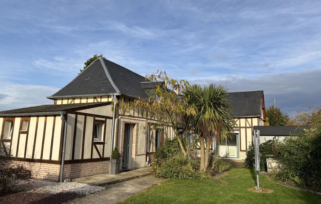 Maison normande sur un terrain d'environ 1100m² comprenant: entrée avec placard, cuisine aménagée, arrière-cuisine, séjour/salon avec poêle à bois, deux chambres dont une avec mézzannine au-dessus, salle de douche, buanderie et wc.